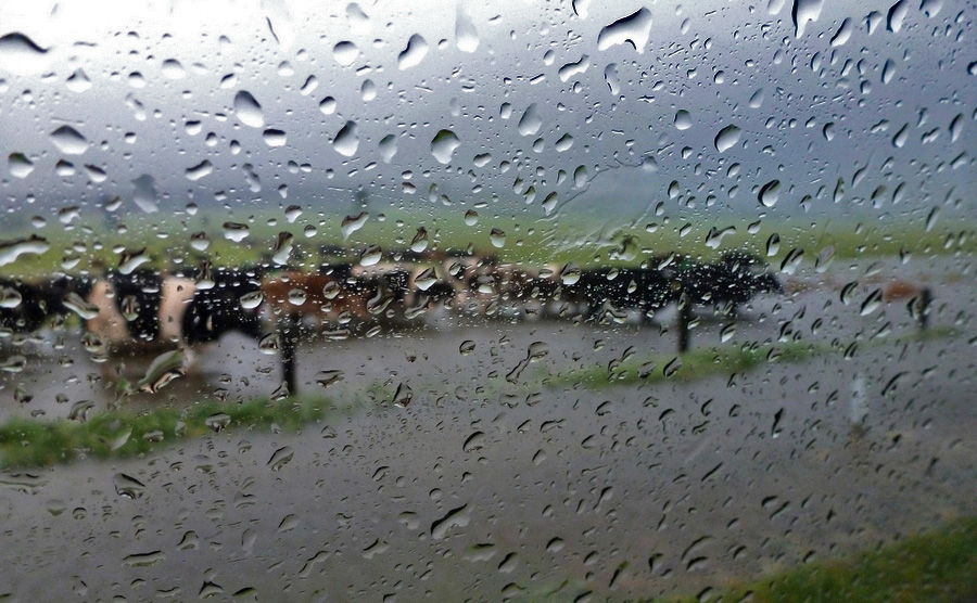 | Les prés des vaches sont partiellement inondés, les fossés débordent, et la route est parfois également sous l'eau. |