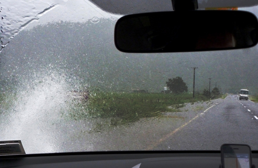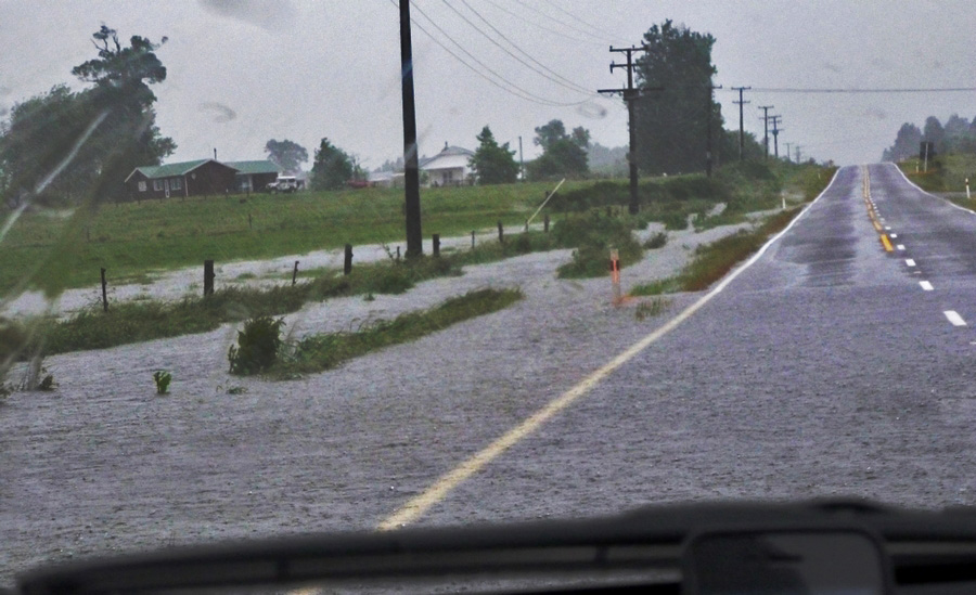 | La route continue de longer la cote et descend vers le sud. La pluie est vraiment violente, et tout le paysage n'est qu'eau, en haut, en bas, partout... |