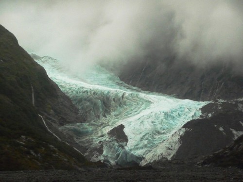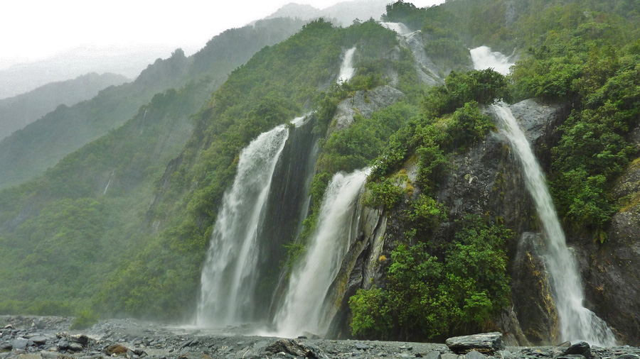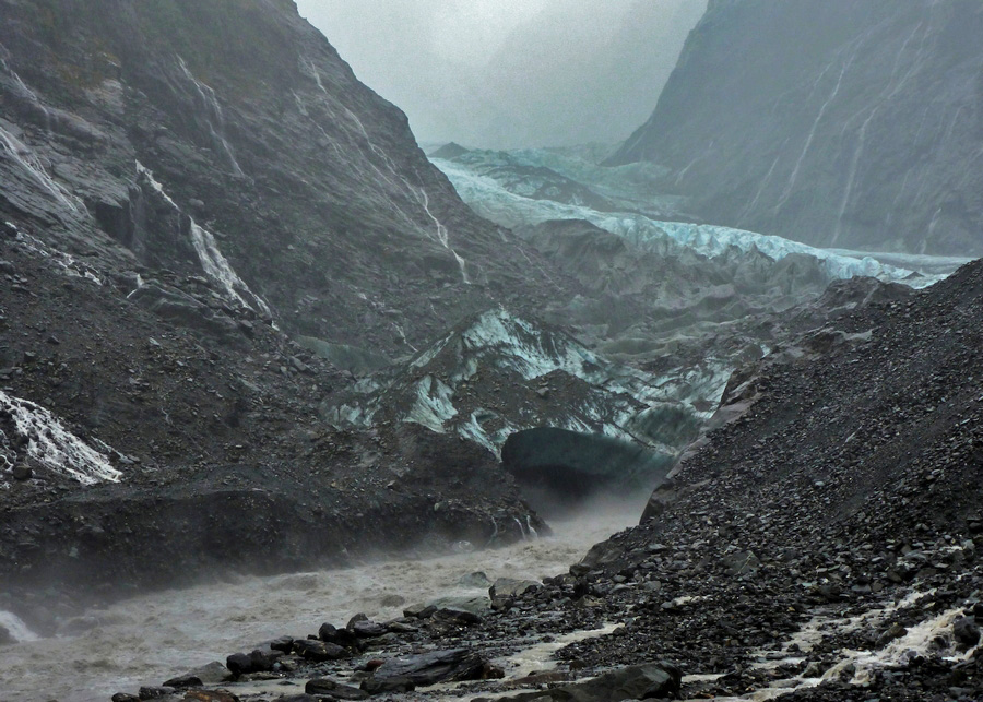 Halte obligatoire au glacier Franz Josef, en ayant bien entendu pris quelques précautions : les fortes pluies n'ont pas baissées d'intensité depuis la matinée. Imperméable de haut en bas, c'est parti pour aller voir le glacier situé le plus proche du niveau de la mer au monde. La vallée glaciaire est pratiquement déserte. Avec la pluie, on discerne difficilement le haut des montagnes autour, mais c'est suffisant pour se rendre compte de la grandeur des lieux. L'eau est litteralement partout : elle s'écoule en cascades multiples sur les flancs des montagnes, coule à flot au milieu de la vallée, et inonde les chaussures au bout de 2 minutes. |