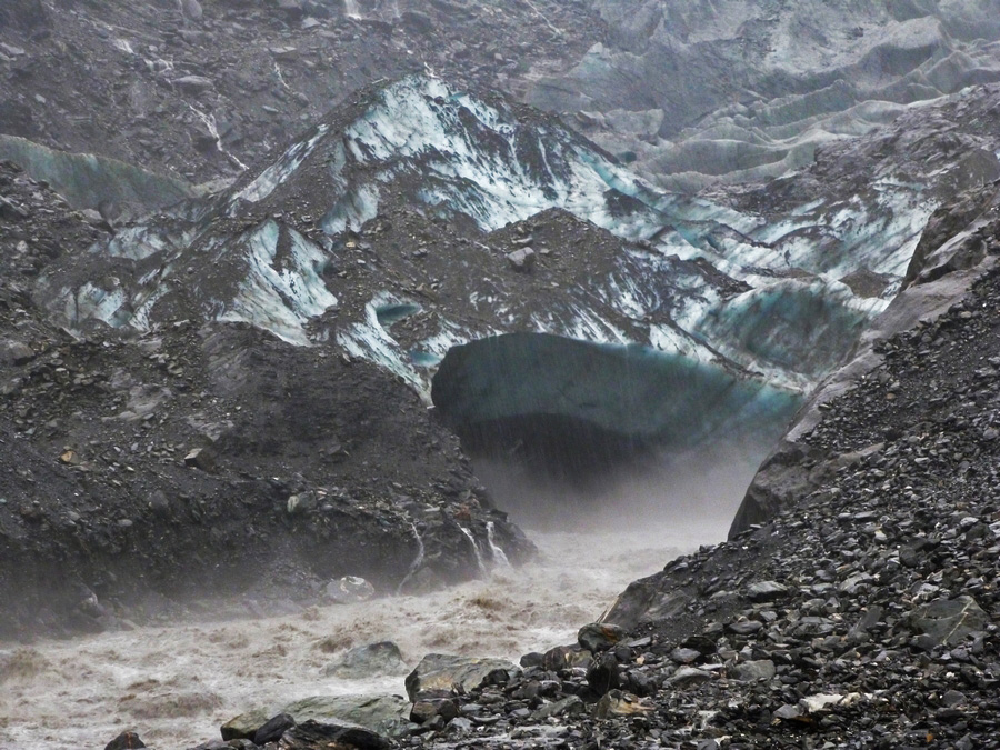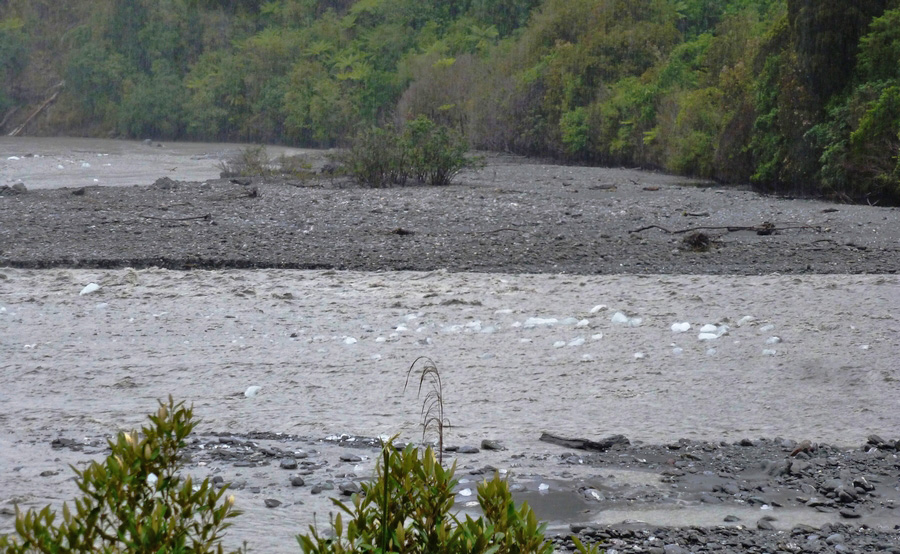 Surprise sur chemin du retour : le pont était toujours là pour traverser la rivière, mais par contre un bras du torrent est venu couper le sentier. En à peine 20-30 minutes pour atteindre le glacier, c'est un petit torrent déjà assez profond qui a pris place sur le seul sentier de la vallée... vu les précipitations, le paysage et le niveau de l'eau change extremement rapidement ! Heureusement, un guide présent sur les lieux vient porter assistance aux 2 seules perseonnes présentes dans la vallée et nous aide également à traverser. Il fallait en effet bien choisir l'endroit : marcher dans le torrent d'eau directement issu du glacier avec de l'eau à mi-cuisse, ça réveille, mais il faut vraiment se méfier du courant... |