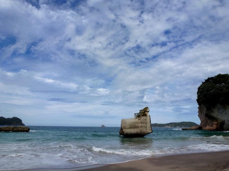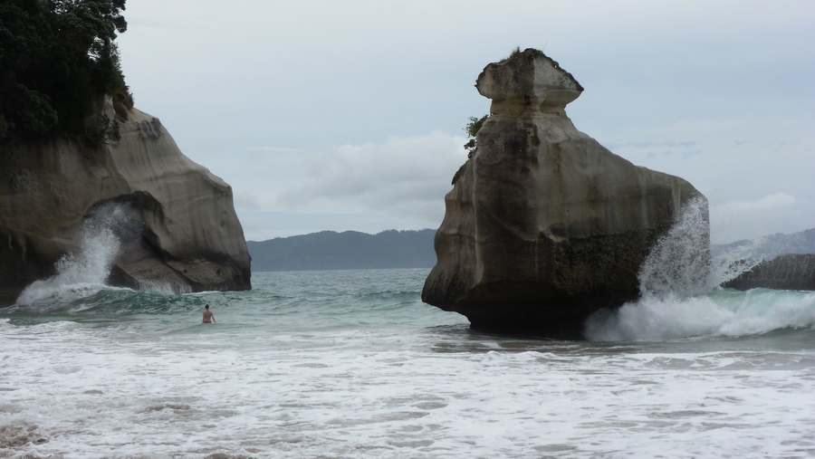 Après-midi repos sur cette même plage de cathedral cove, face à ce curieux rocher creusé par les vagues. La couleur de l'océan est magnifique, et avec quelques vagues par dessus, c'est vraiment la journée idéale pour profiter de la plage. |