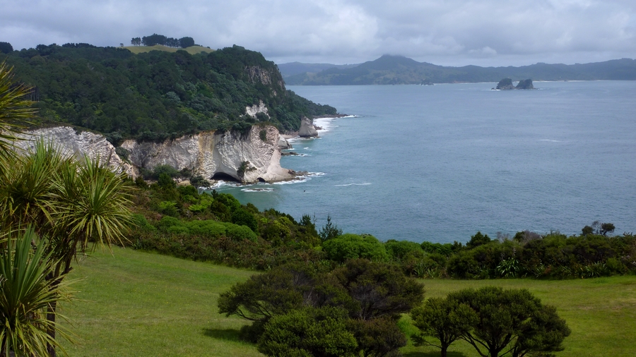 | Sur le long de la cote, on trouve un sentier qui permet de longer l'océan et d'accéder aux différentes criques et plages, désertes pour la plupart, dont Cathedral cove qui est réputée pour son arche creusée dans la falaise. |