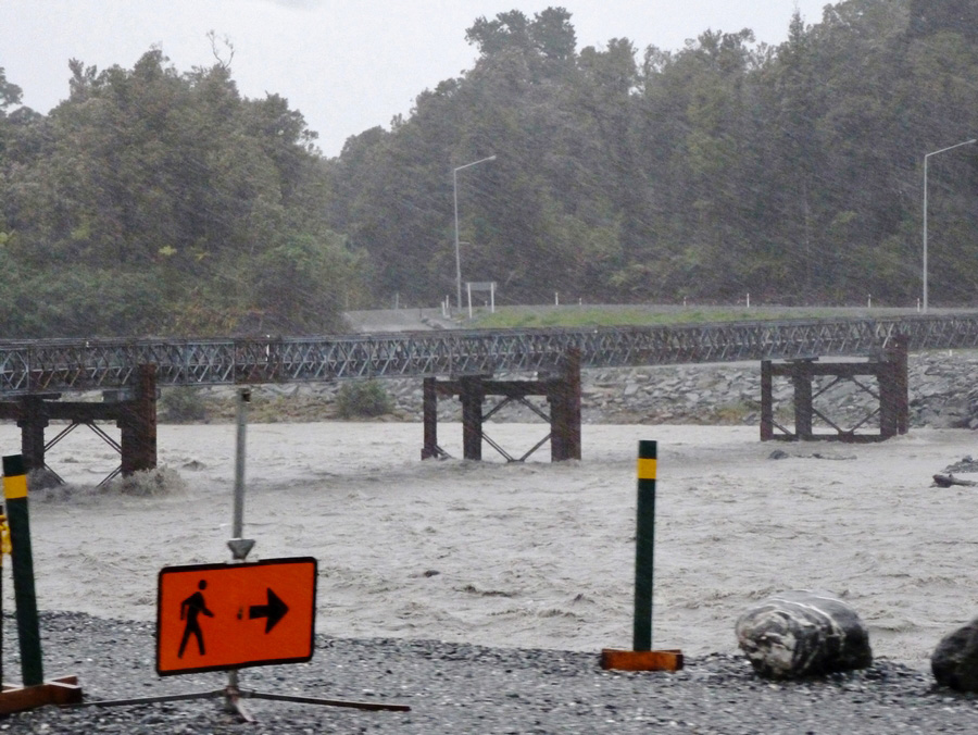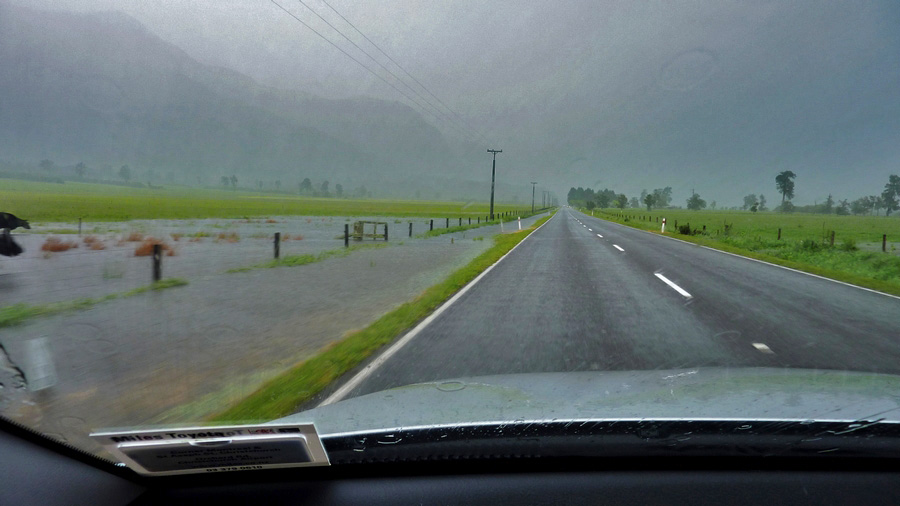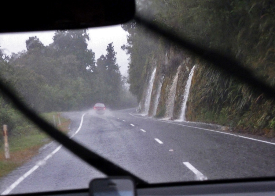 | Retour sur la route, toujours sous une cascade d'eau, pour rejoindre Fox Glacier pour une pause au chaud bien méritée. |