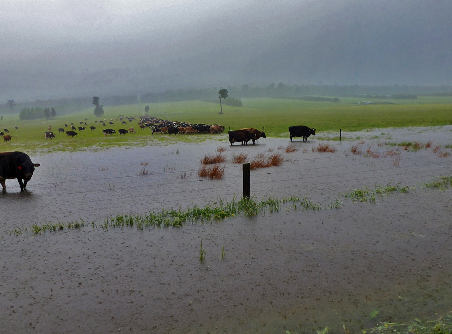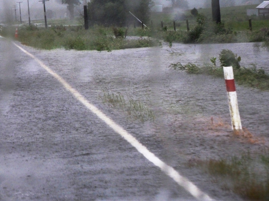 | Les prés des vaches sont partiellement inondés, les fossés débordent, et la route est parfois également sous l'eau. |