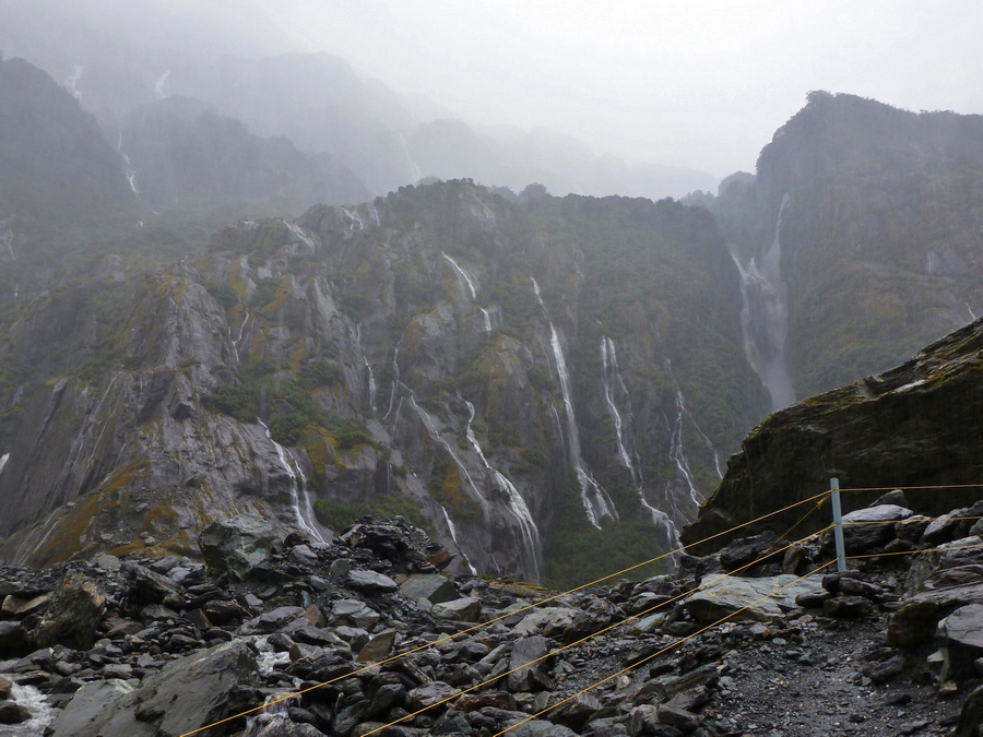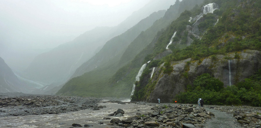 Halte obligatoire au glacier Franz Josef, en ayant bien entendu pris quelques précautions : les fortes pluies n'ont pas baissées d'intensité depuis la matinée. Imperméable de haut en bas, c'est parti pour aller voir le glacier situé le plus proche du niveau de la mer au monde. La vallée glaciaire est pratiquement déserte. Avec la pluie, on discerne difficilement le haut des montagnes autour, mais c'est suffisant pour se rendre compte de la grandeur des lieux. L'eau est litteralement partout : elle s'écoule en cascades multiples sur les flancs des montagnes, coule à flot au milieu de la vallée, et inonde les chaussures au bout de 2 minutes. |