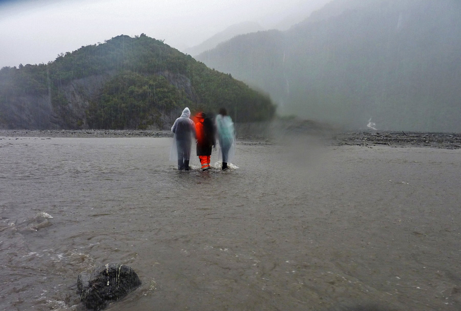 Surprise sur chemin du retour : le pont était toujours là pour traverser la rivière, mais par contre un bras du torrent est venu couper le sentier. En à peine 20-30 minutes pour atteindre le glacier, c'est un petit torrent déjà assez profond qui a pris place sur le seul sentier de la vallée... vu les précipitations, le paysage et le niveau de l'eau change extremement rapidement ! Heureusement, un guide présent sur les lieux vient porter assistance aux 2 seules perseonnes présentes dans la vallée et nous aide également à traverser. Il fallait en effet bien choisir l'endroit : marcher dans le torrent d'eau directement issu du glacier avec de l'eau à mi-cuisse, ça réveille, mais il faut vraiment se méfier du courant... |
