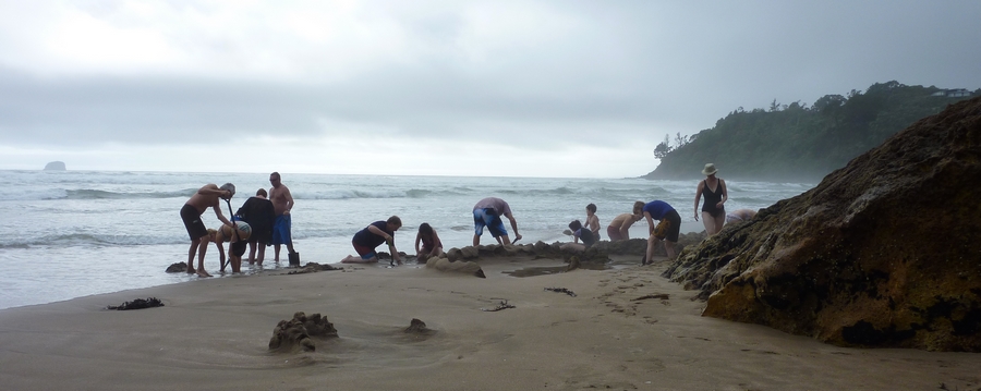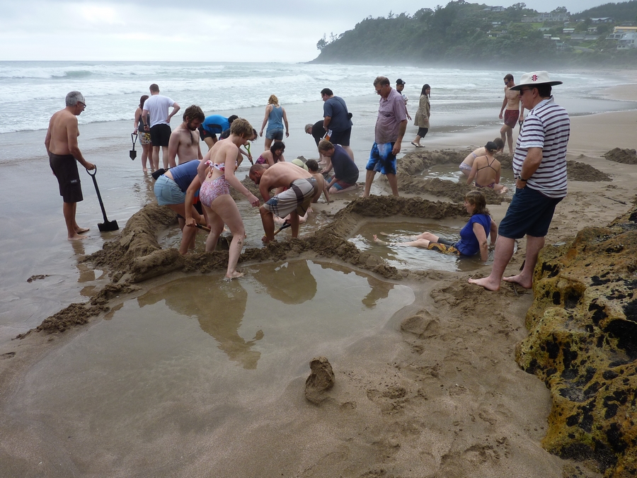 Débarquement peu après 8h30 sur hot water beach, parfait, il y a peu de monde encore... La particularité de cette plage, c'est qu'on y trouve aussi des sources d'eau chaude. A marée basse, il suffit avec une pelle de creuser au bon endroit pour se faire soi-même une petite piscine d'eau chaude. Amusant ! |