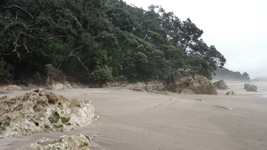 | Sur le long de la cote, on trouve un sentier qui permet de longer l'océan et d'accéder aux différentes criques et plages, désertes pour la plupart, dont Cathedral cove qui est réputée pour son arche creusée dans la falaise. |